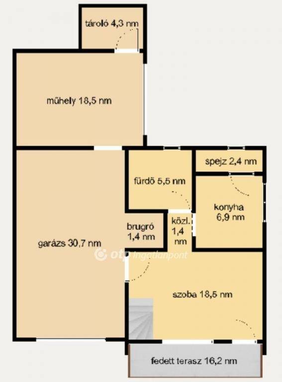 A lakótér kialakítása fantázia és személyes igények mentén ötletesen és paraktikusan is megoldható. Lehet akár egy emeleti nappali vagy egy plusz szoba kialakítva a galérián, de mivel egy garázsnak is beillő műhely van az épület mögött, akár a jelenlegi garázsból is kialakítható még egy szoba.