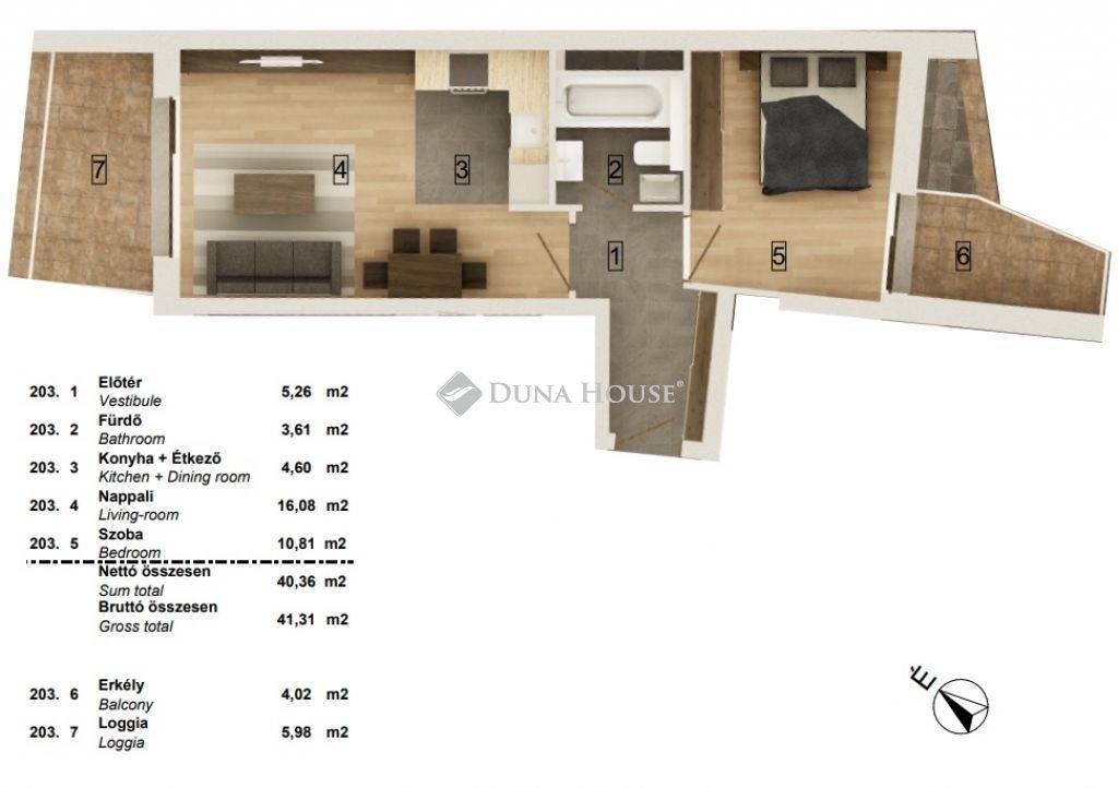 40,36 m2-es, amerikai konyhás nappali + 1 hálószobás lakás, összesen 10 m2 fedett terasszal.