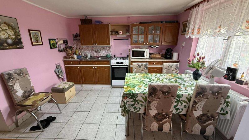Die Immobilie hat drei Zimmer, eine gut gestaltete, großzügige und helle Essecke sowie Küche.Ein Teil ist aus Mischmaterial gebaut, der größere Teil wurde später hinzugefügt.