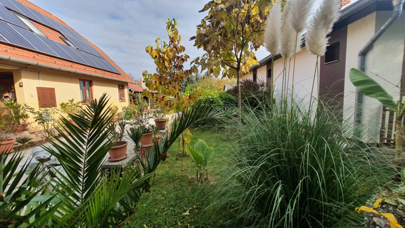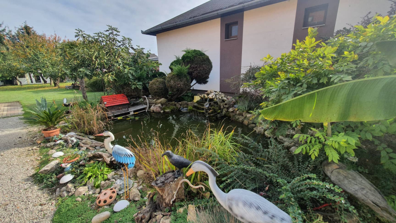 Parkosítva,tele mediterrán dísznövényekkel,kerti tóval,robot fűnyíróval,gyümölcsfákkal és nem utolsósorban egy üvegházzal!!!