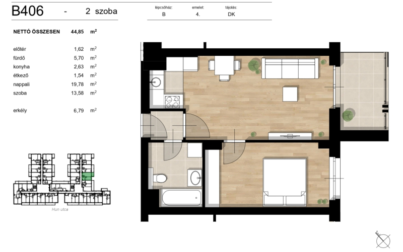 Budapest XIII. kerületében a Hun utcában, új építésű társasházban eladásra kínálok negyedik emeleti, 45 nm-es lakást, 7 nm-es erkéllyel.