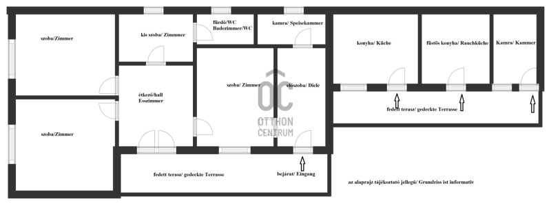 - főépület: előszoba, kamra, szoba, étkező/hall, 3 külön bejáratú hálószoba, fürdőszoba/WC , fedett terasz