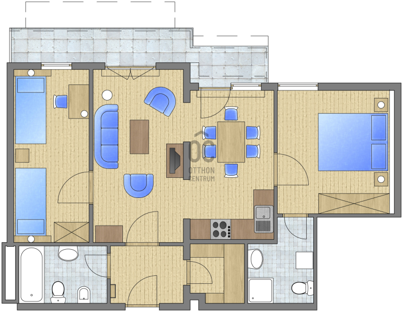 A lakás bútorozott, klímás és gépesített, maximum 4 főre javasolt.