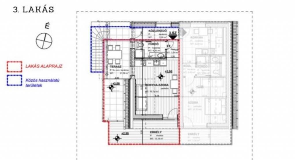 3.lakás : (emelet) alapterület: 26m2 + 21,58m2 terasz + 15,18m2 erkély + 39 m2 kertrész .