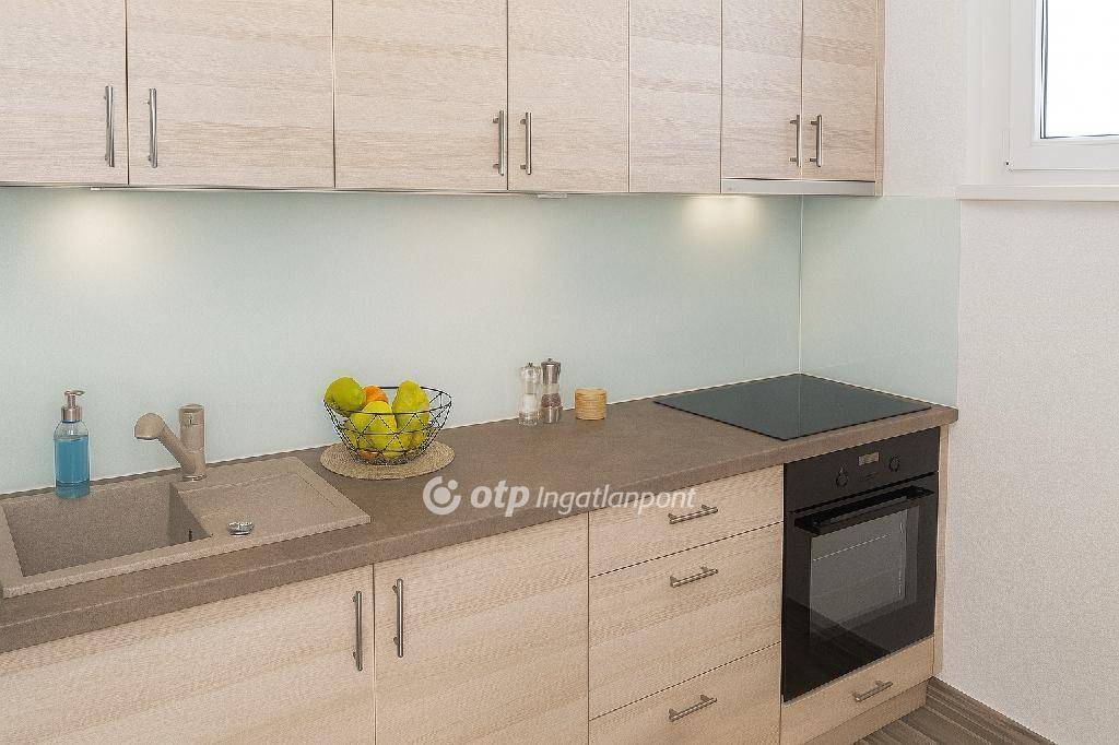 A teljes körű felújítás során a lakás minden részletére figyelmet fordítottak: korszerűsítették a teljes villanyhálózatot, amely hosszú távon biztonságos működést garantál, valamint új, modern konyhabútort építettek be, amelyhez elegáns mosogató, kerámialapos tűzhely és beépített sütő is tartozik.