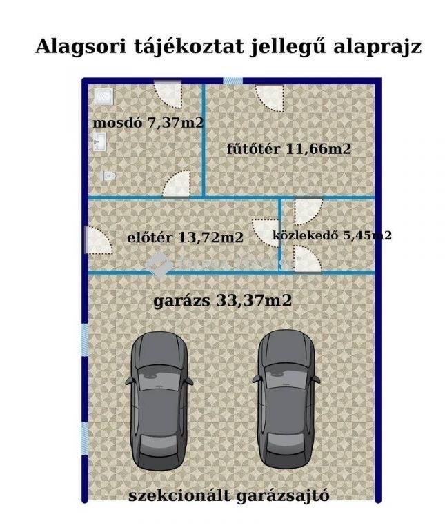 Az alagsori szinten találhatóak a kiszolgáló helységek, és két gépjármű részére beállási lehetőséget biztosító garázs. Kívülről is megközelíthető, a lakótértől független, így zavartalan közlekedést biztosít.