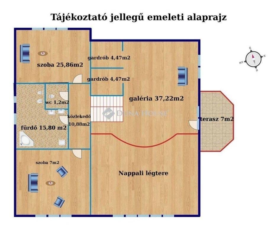 Az emelet egy részét, 37,22 m2-s galéria képezi. Továbbá, két külön megközelíthető szobán kívül, van két gardrób helység is. Minden szobában egyedileg szabályozható klímaberendezés található. A földszinten és az emeleten is tágas, káddal és zuhanyzóval ellátott fürdőszoba lett kialakítva.
