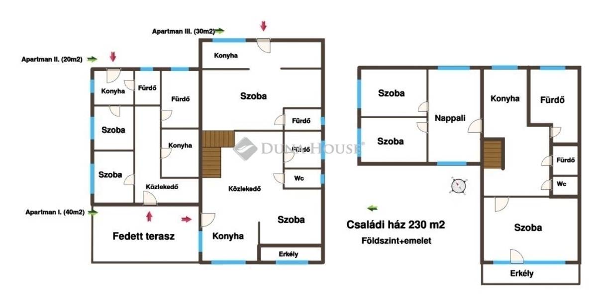Az összesen 320 m²-es lakóterületű, 9 szobás ház jelenleg több különálló lakásként funkcionál, ami lehetővé teszi akár több generáció együttélését, akár bérbeadási célú hasznosítását. A főépületben egy nappali, konyha-étkező, dupla fürdőszoba, dupla WC és négy hálószoba található, amelyek közül további szobák kialakítása is lehetséges. Az épülethez egy különálló, 60 m²-es földszinti lakás is kapcsolódik, valamint több önálló apartman került kialakításra, amelyek külön bejárattal rendelkeznek.