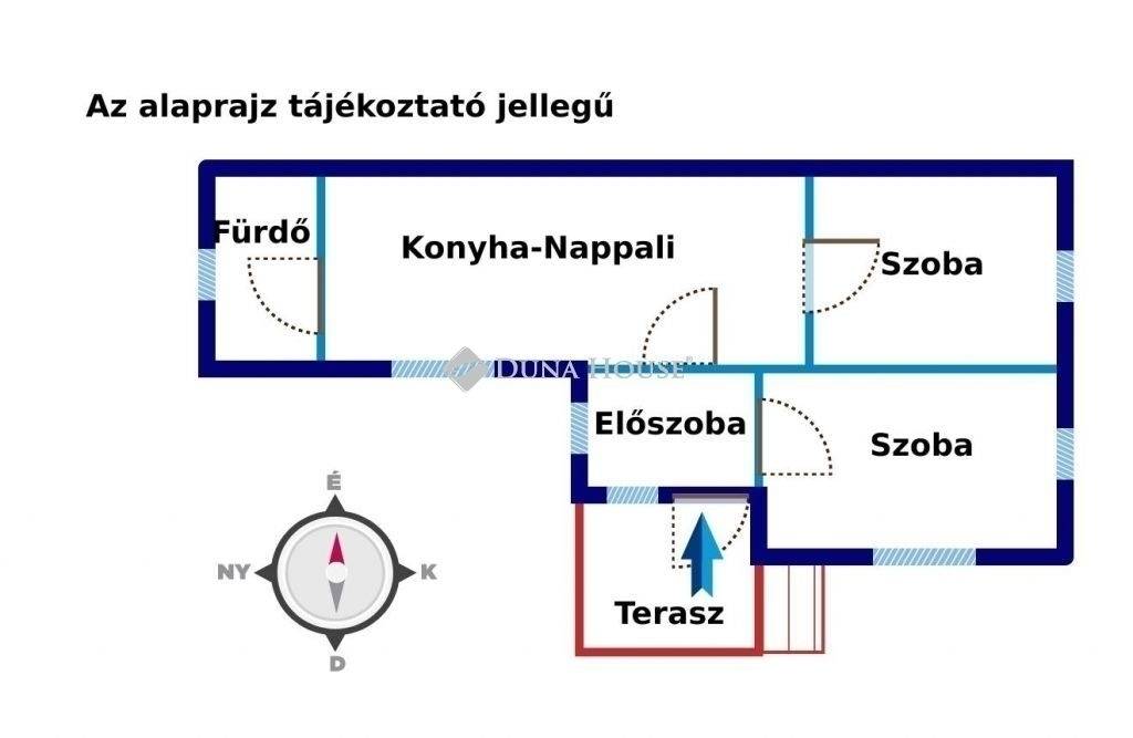 Két szoba, nappali +étkező +konyha, fürdő, előtér és terasz.