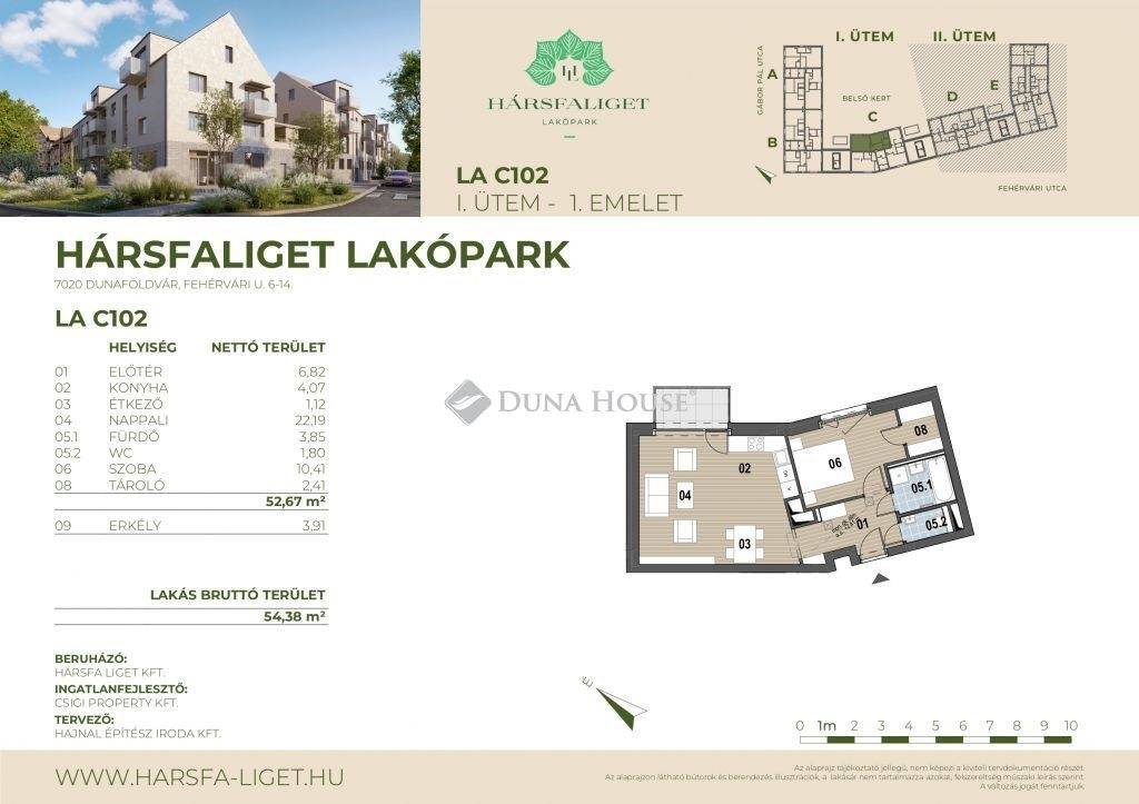 Üdvözöljük Dunaföldvár legújabb lakóparkjában!A Hársfaliget Lakópark csendes, belvárosi, zöldövezeti környezetben épül Dunaföldváron. A modern otthonok ideális választást jelentenek mindazok számára, akik a nyugalmat, a korszerű építészeti megoldásokat keresik. Legyen szó családi otthonteremtésről vagy befektetési célú vásárlásról, nálunk könnyedén megtalálhatja az igényeihez leginkább illő újépítésű ingatlant.Az I. ütemben 46 és 87 m² közötti alapterületű, újépítésű lakások érhetők el, zöld környezetben, igény szerint garázzsal, parkolóval kiegészítve.Lakástípusaink:Stúdiólakás tökéletes választás egyedülállóknak vagy befektetők, idősek számára. Előnye a praktikus, kompakt elrendezés, alacsony fenntartási költség, könnyen kiadható illetve minden fontos szolgáltatás elérhető a közelben.Nappali + 0,5 szobás ideális választás pároknak, egyedülállóknak vagy home office-ban dolgozóknak. Az 1+fél szobás lakás tökéletesen ötvözi a kényelmet és a praktikusságot a kisebb szoba dolgozósaroknak, gardróbnak vagy vendégszobának is kiváló. Megfizethető, jól kihasználható élettér, akár befektetésnek is! Tágas nappali, külön hálószoba tökéletes választás pároknak vagy egyedülállóknak! A nappali + 1 szobás lakás ideális otthon lehet, ha fontos a szeparált élettér, de nem szeretnél nagy lakásra költeni. Kényelmes elrendezés, praktikus méret, akár otthoni munkavégzéshez is! Tágas nappali + 2 szobás lakás erkéllyel, zöld környezetben otthon, ahol igazán jól érezheti magát a család.A külön nyíló szobák kényelmes, élhető tereket biztosítanak, a világos nappali pedig a közös pillanatok tökéletes helyszíne lehet. A zárt belső udvar nyugalmat és biztonságot nyújt, míg a közösségi tér lehetőséget teremt a kikapcsolódásra vagy egy barátságos beszélgetésre a szomszédokkal. Egy otthon, ahol a kényelem, a nyugalom és a jó elrendezés természetes. Tágas nappali + 3 szoba otthon minden generációnak és élethelyzetnek!Ez a lakás bőséges teret biztosít nagyobb családoknak, home office-ban dolgozóknak vagy kreatív hobbik kedvelőinek. Külön hálószobák, dolgozószoba és vendégszoba egyben, így mindenki megtalálja a saját helyét. Ideális választás, ha fontos a kényelem, a funkcionalitás és a sokoldalúság!A lakások hűtését és fűtését a legkorszerűbb, környezetbarát talajszondás hőszivattyúval oldjuk meg, a hőleadók fan-coilok lesznek. Minden szobában és a nappaliban fan-coil kerül elhelyezésre.Lakásokhoz saját garázs, parkoló vásárolható, melyek elektromos töltési ponttal kiegészíthetők.A kivitelezés során kizárólag korszerű, minőségi anyagokat használunk, különös figyelmet fordítva az energiahatékonyságra és az időtállóságra. A célunk, hogy lakóink valóban élhető, világos és kényelmes otthonban kezdhessék meg új életüket.További részletekért kérem hívjon bizalommal, illetve keresse fel a lakópark honlapját, hársfa-liget.hu címen!