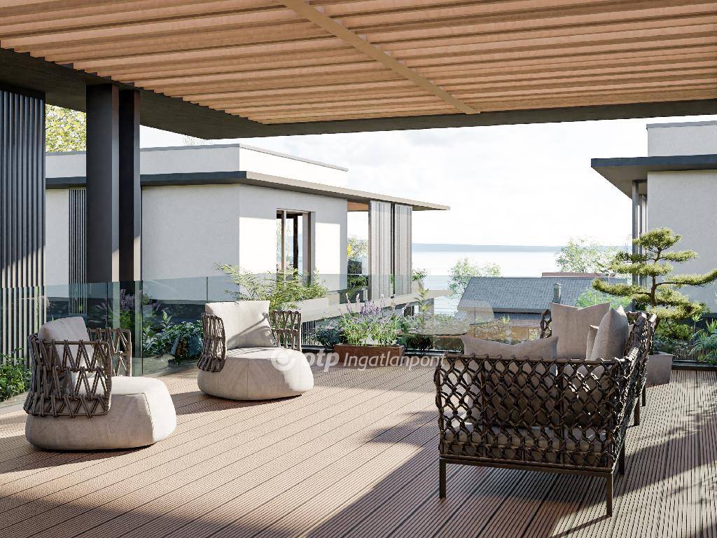 Eladó Luxus villák a Balaton egyik közkedvelt részén! A telek 80 m-re helyezkedik el a Balatontól, mely nyugodt, csendes helyen található. Különleges tervezésnek köszönhetően minden villaház balatoni panorámával rendelkezik. A beruházás több mint 6000 m2?en valósul meg, jelen állapotban kivitelezés alatt. A 13 darab villaház három sorban, egymástól függetlenül helyezkednek el. A kivitelezés folyamán mind az anyaghasználatban és technológiában a legmagasabb minőséget használják fel. A projekt kialakításának és kidolgozottságának köszönhetően egyedi, kivételes beruházás. Mindegyik villa saját parkosított, öntözőrendszerrel ellátott kerttel rendelkezik. A házak egymástól fizikálisan 1,8 m magas borostyán kerítéssel vannak elválasztva, ezzel a vertikális örökzöld fallal biztosítva a természet közelségét, ellenben az egymástól való távolságot a nyugodt kikapcsolódáshoz szükséges intimitást. A házak földszintjén tágas, a mai kornak megfelelően kialakított kertkapcsolatos nappali, étkező és konyha került kialakításra, amely a legtöbbet használt közösségi tér. Az emeleten két darab teljes méretű szoba és hozzá tartozó gardrób került elhelyezésre, valamint egy nagyméretű káddal és zuhanyzóval is ellátott fürdőszoba. Mindkét szoba rendelkezik loggiával, így a természet közelsége itt is jelen van. A felső emeleten található egy nagy szoba gardróbbal és a hozzá tartozó fürdőszobával. Valamint itt található egy több mint 40 m2 -es tetőterasz, statikus árnyékolással és balatoni panorámával.