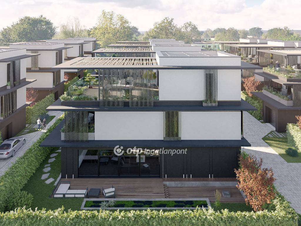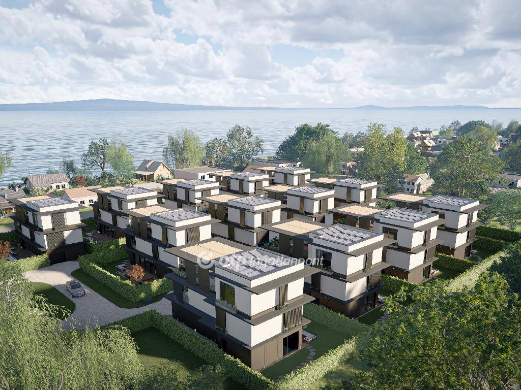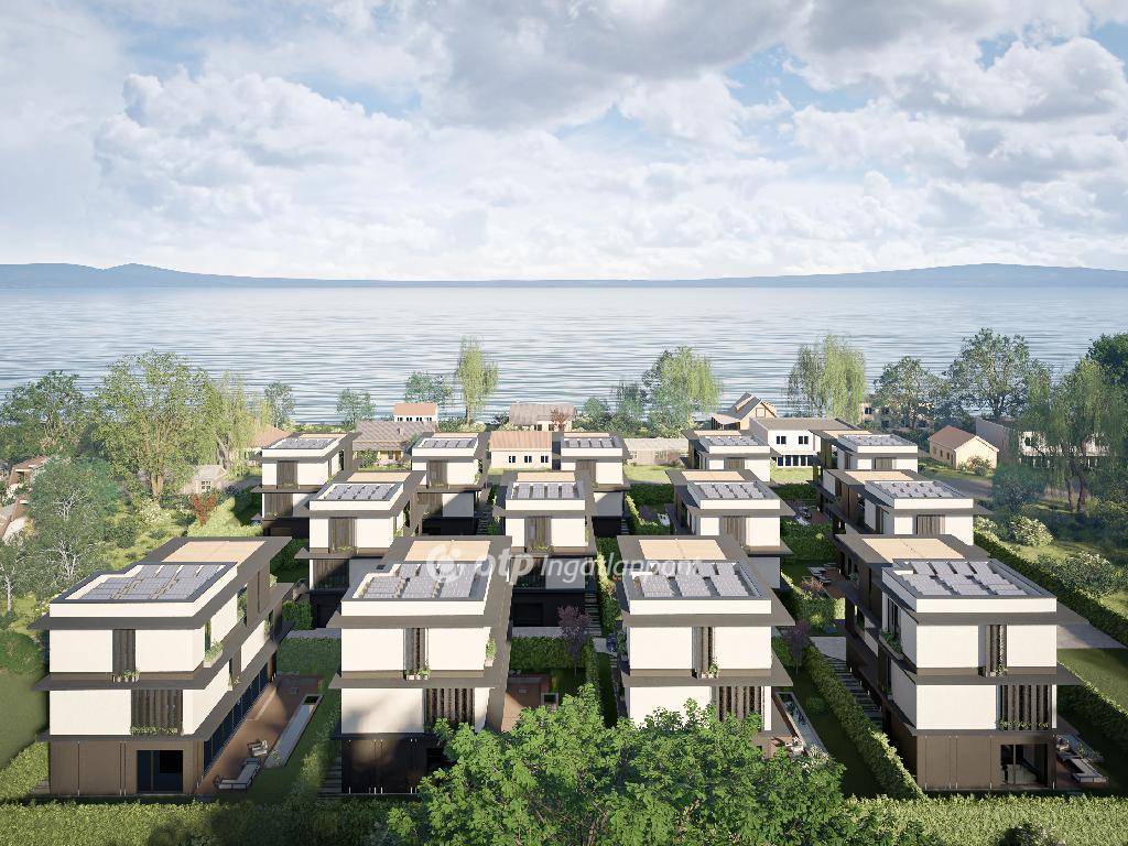 Eladó Luxus villák a Balaton egyik közkedvelt részén! A telek 80 m-re helyezkedik el a Balatontól, mely nyugodt, csendes helyen található. Különleges tervezésnek köszönhetően minden villaház balatoni panorámával rendelkezik. A beruházás több mint 6000 m2?en valósul meg, jelen állapotban kivitelezés alatt. A 13 darab villaház három sorban, egymástól függetlenül helyezkednek el. A kivitelezés folyamán mind az anyaghasználatban és technológiában a legmagasabb minőséget használják fel. A projekt kialakításának és kidolgozottságának köszönhetően egyedi, kivételes beruházás. Mindegyik villa saját parkosított, öntözőrendszerrel ellátott kerttel rendelkezik. A házak egymástól fizikálisan 1,8 m magas borostyán kerítéssel vannak elválasztva, ezzel a vertikális örökzöld fallal biztosítva a természet közelségét, ellenben az egymástól való távolságot a nyugodt kikapcsolódáshoz szükséges intimitást. A házak földszintjén tágas, a mai kornak megfelelően kialakított kertkapcsolatos nappali, étkező és konyha került kialakításra, amely a legtöbbet használt közösségi tér. Az emeleten két darab teljes méretű szoba és hozzá tartozó gardrób került elhelyezésre, valamint egy nagyméretű káddal és zuhanyzóval is ellátott fürdőszoba. Mindkét szoba rendelkezik loggiával, így a természet közelsége itt is jelen van. A felső emeleten található egy nagy szoba gardróbbal és a hozzá tartozó fürdőszobával. Valamint itt található egy több mint 40 m2 -es tetőterasz, statikus árnyékolással és balatoni panorámával.