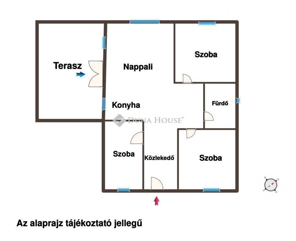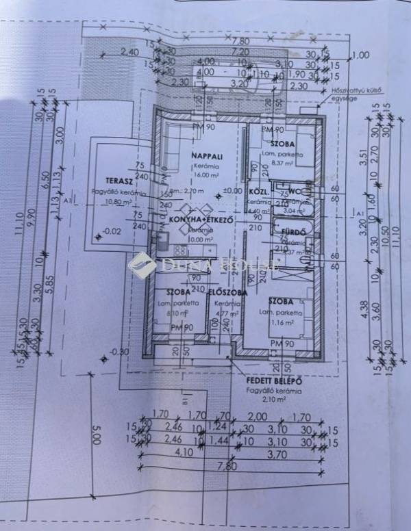 - Elosztása: terasz, előszoba, közlekedő, nappali-konyha, 3 szoba, fürdőszoba, wc