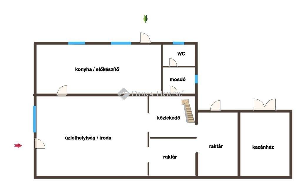 - konyha, üzlethelyiség/ vagy iroda, raktár, mosdó, tetőtérben: szoba