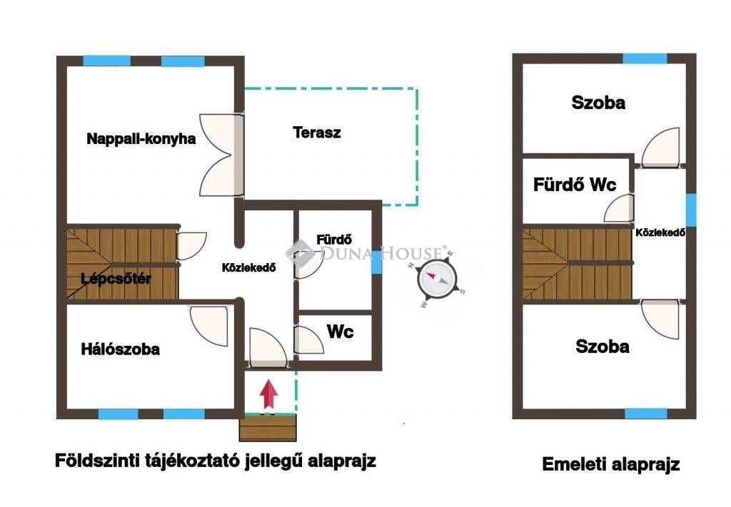 A földszinten szélfogó, fürdőszoba, különálló wc, nappali-konyha-étkező és egy hálószoba valamint a részben fedett terasz található.