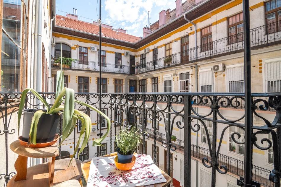 Eladó egy világos, 85 m²-es, külön bejáratú lakrészekkel rendelkező lakás a VI. kerületben, a Szinyei Merse utcában.