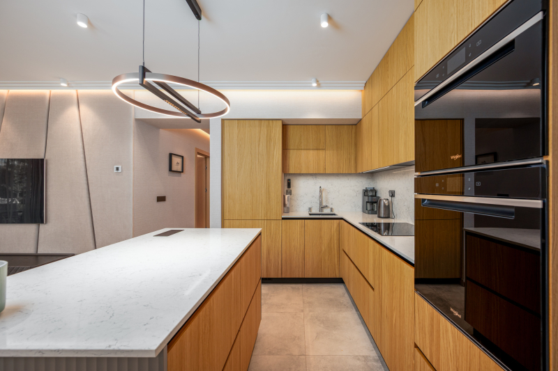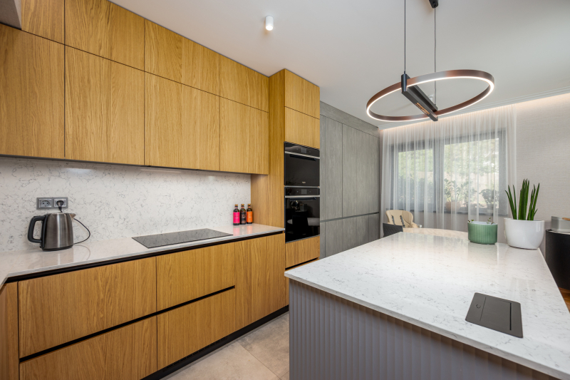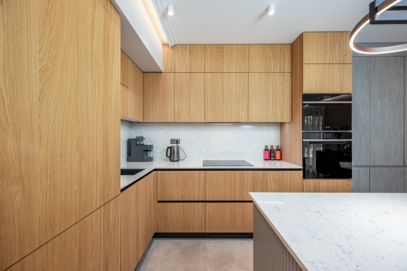 Modern konyha konyhaszigettel, beépített tálalószekrénnyel (rejtett