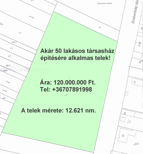 A telek akár 50 lakásos társasház építésére vagy céges telephelynek is kiválóan alkalmas! A telek minden oldalról teljesen körbe van kerítve.