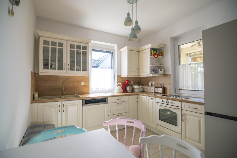 - étkező-konyha (9 m2), a nappalival egy légtérben, prémium minőségű konyhabútorral és beépített gépekkel (mosogatógép, sütő, főzőlap)