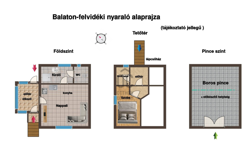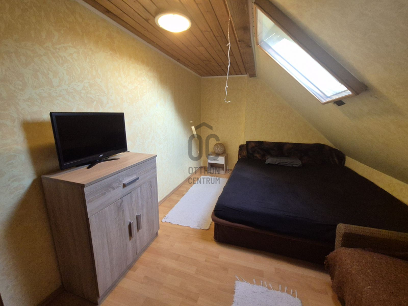A tetőtér a ház külső lépcsőjén közelíthető meg. Itt van egy kis előtér; egy kellemes tetőtéri szoba / velux tetőtéri ablakkal, gyönyörű szép kilátással a kertre és a Keszthelyi-medencére, és egy kis helyiség, amiben kialakítható egy kis mellékhelyiség is kézmosóval. A fűtés a tetőtérben elektromos panellal megoldott. A tetőtér teljesen le van szigetelve és lambéria burkolatos.