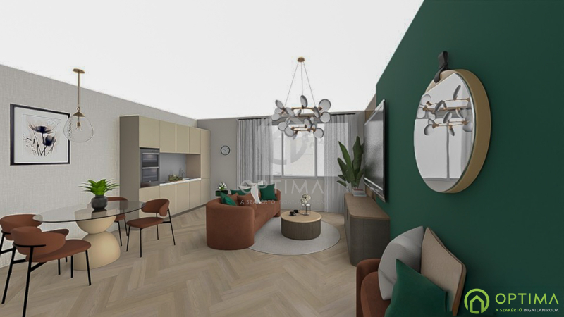 A tágas, 44 m²-es ÉTKEZŐ-KONYHA-NAPPALI a lakás igazi központi élettere.