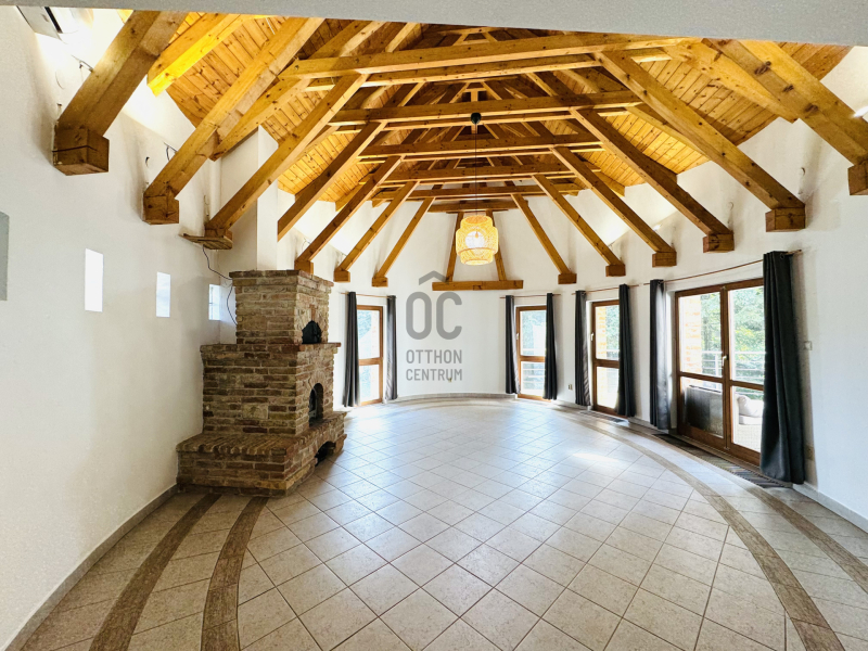 Első szint: a ház központi tere egy lenyűgöző, kb. 55 m²-es, nagy belmagasságú nappali, impozáns gerendákkal és hangulatos cserépkályhával, amelynek felső része pizzakemenceként is használható. A nappalihoz étkező és konyha kapcsolódik. Ezen a szinten két hálószoba és két fürdőszoba található.