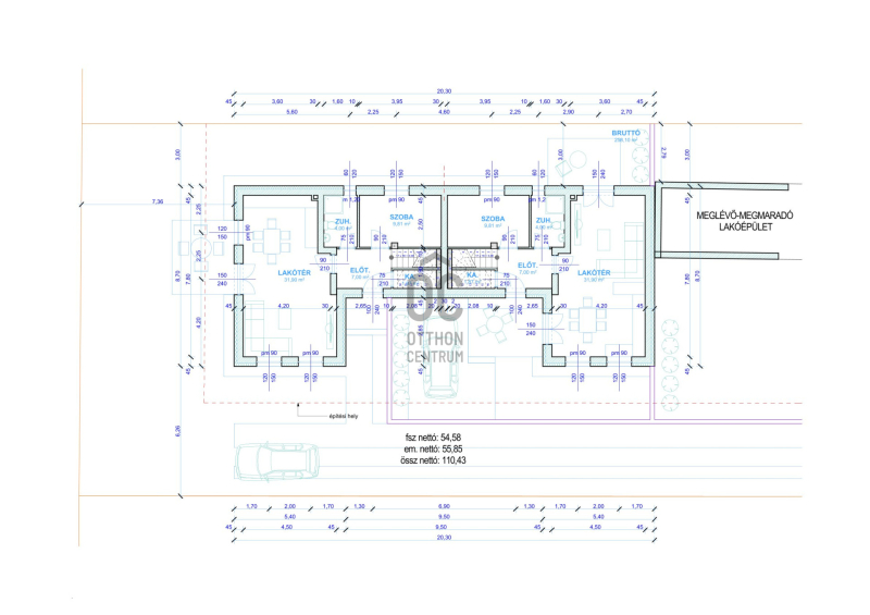 110 nm hasznos alapterületű, amerikai konyhás nappali, 4 hálós, 2 fürdőszoba-wc, kamra, terasz és saját kerttel rendelkezik, autónak udvari beálló!