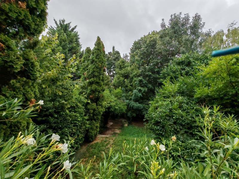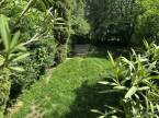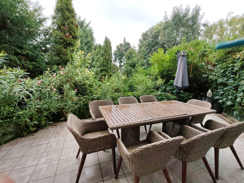 Az alsó szinten a tágas, világos nappaliból közvetlenül egy nagy kertkapcsolatos terasz előnyeit élvezhetjük. A kert több éves fákkal övezett területe teljes intimitást biztosít, ahol egy kerti medence felállítására is alakítottak ki helyet.