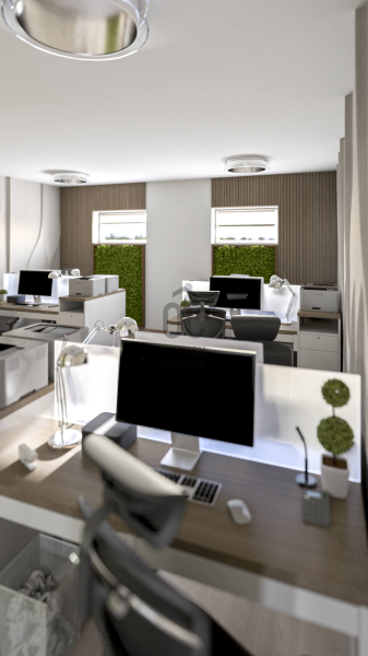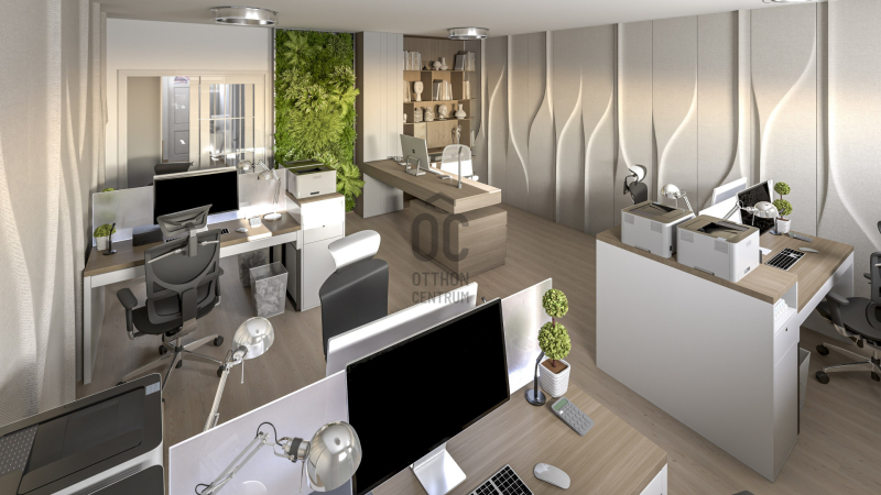 - Fa-alumínium nyílászárók, hőszivattyús hűtés-fűtés, valamint előkészített okosotthon-rendszer garantálja a modern munkakörnyezetet.