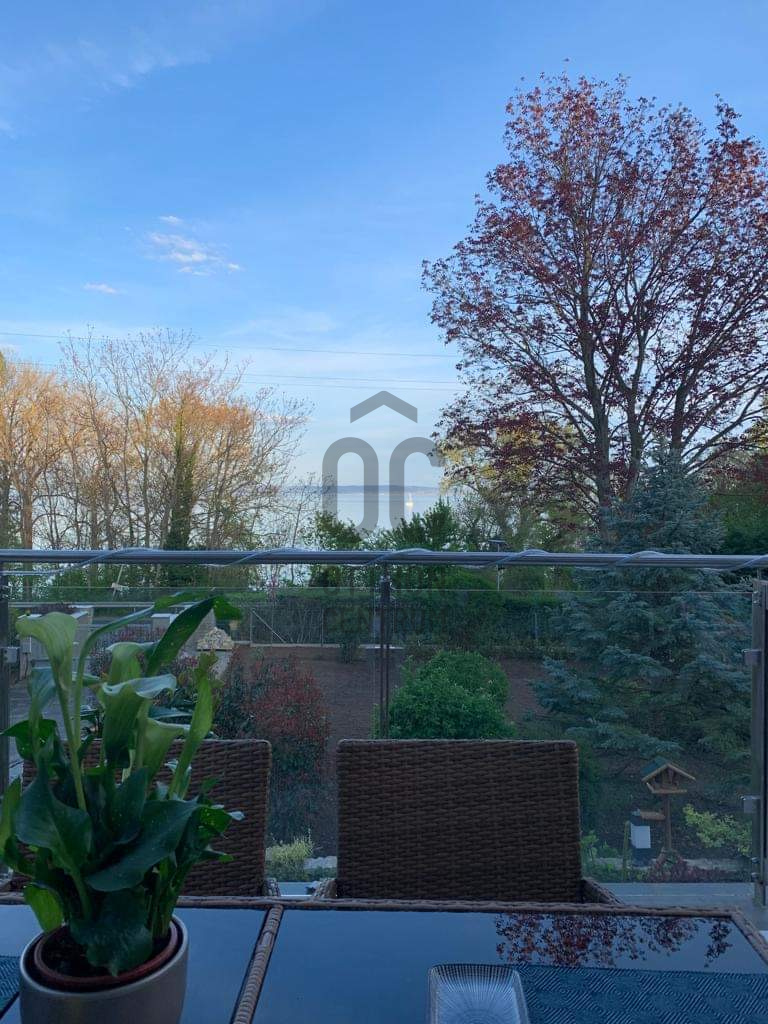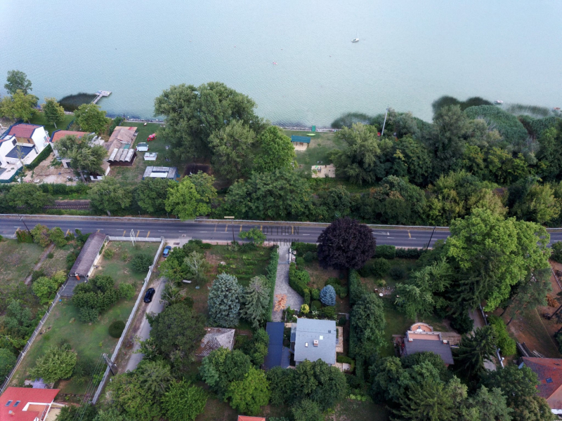 A földszinten fürdőszoba+wc, egy amerikai konyha és nappali, valamint egy gardrób helyiség is található. Ehhez a részhez kapcsolódik egy balatoni panorámával rendelkező terasz.