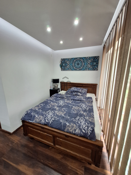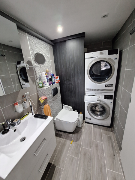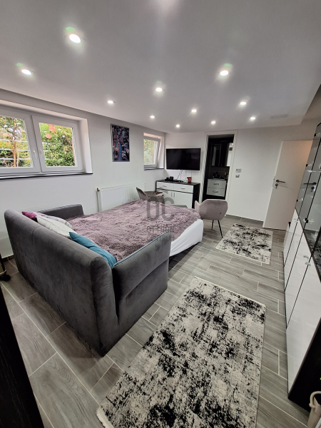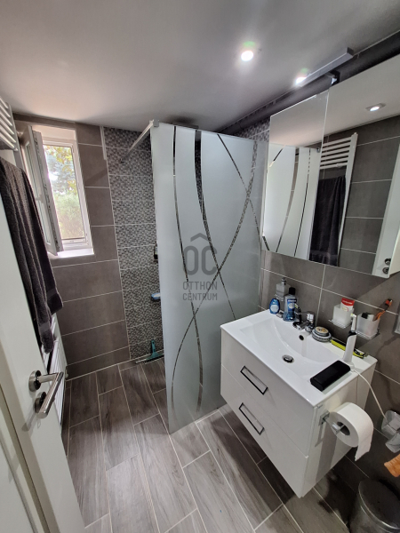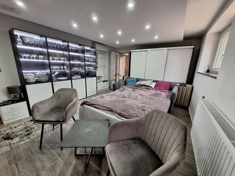 A külön bejáratú, kertkapcsolatos szuterénben mosókonyhával összekötött fürdőszoba+wc, valamint egy nappali található.