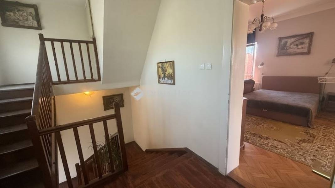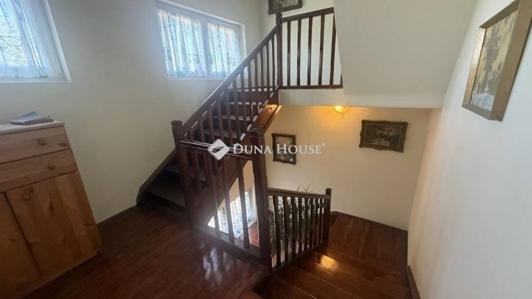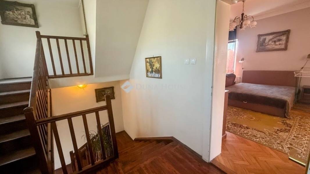 Az emeletre kényelmes fa lépcsősoron keresztül jutunk, ahol az előtér tágas maradt. Innen mehetünk a padlás irányába tovább, ami további helyiségek kialakítását teszi lehetővé.