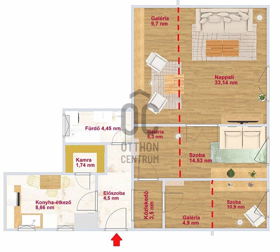 – Mindhárom szoba állógalériás (a nappaliban fémvázas gipszkarton burkolással, a másik kettőben fa szerkezetű)
