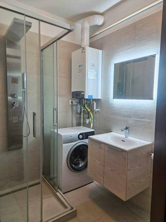 - gépesített konyhabútor ( kerámia főzőlap, sütő, mikró, beépített hűtő),