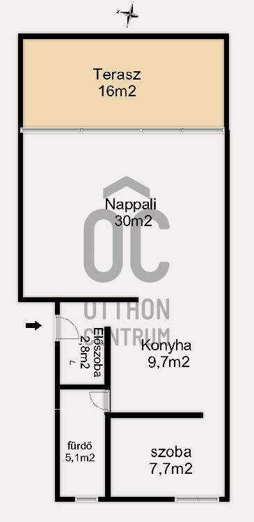 Elosztása: előszoba, amerikai konyhás nappali és étkező, hálószoba, fürdőszoba, terasz.