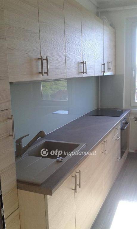 A stílusos, beépített konyhabútor üveg hátlappal, beépített sütővel, indukciós főzőlappal és gránit mosogatóval felszerelve elegáns és időtálló megoldást kínál, amely a főzés szerelmeseinek is örömöt jelenthet.