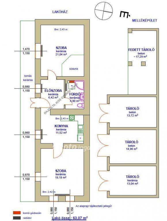 Helyiségek: 2 szoba, konyha, fürdő (WC egyben), előszoba, tornác, melléképület.