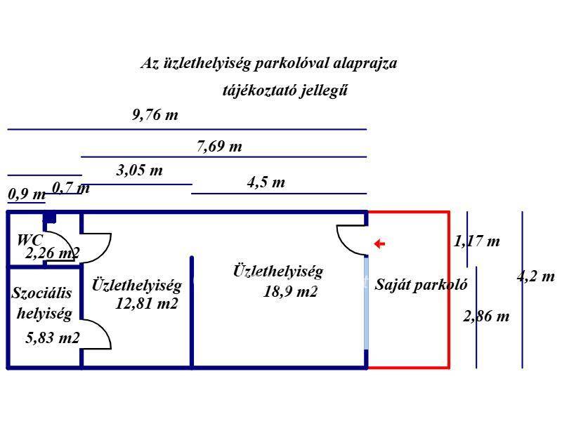Az ingatlan egy két részre osztott 31,72 m2 ügyféltérből, egy tusolóval ellátott szociális helyiségből és egy WC- kézmosó helyiségből áll. Az üzlethelyiséghez tartozik egy saját használatú parkolóhely.