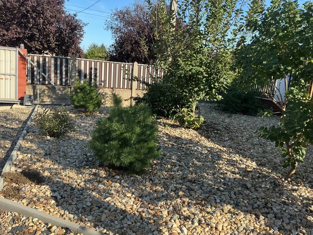 Az udvar szép, rendezett, tágas, elektromos kapuval felszerelt, ahol fedett gépkocsibeálló és több melléképület szolgálja a mindennapi kényelmet.