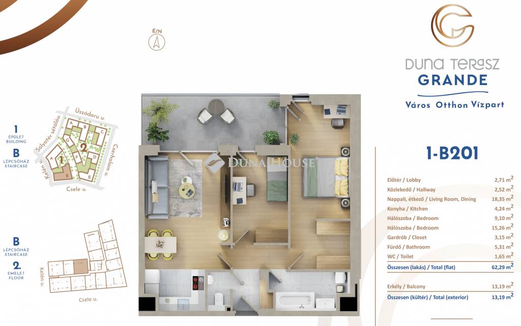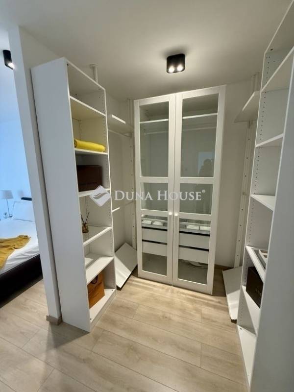 Elosztás: világos nappali-étkező amerikai konyhával, két külön nyíló hálószoba, gardrób helyiség, kádas fürdő + külön WC, erkély, amely nappaliból és hálóból is elérhető
