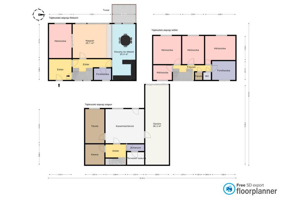 Nagy előnye a háznak a hatalmas, 36 m2-es garázs, amelyben egymás mögött két gépjármű is kényelmesen elfér, ezen a szinten egy önálló lakás is könnyen kialakítható! Az alagsorban jelenleg nagy tároló, kamra, zuhanyzó és egy tervezett szauna helyisége található.
