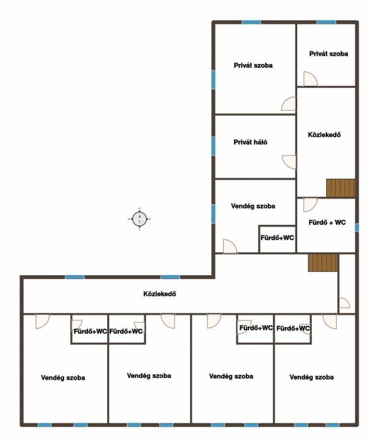 Vendégeknek 6 különálló szoba, mindegyik saját fürdőszobával és WC-vel