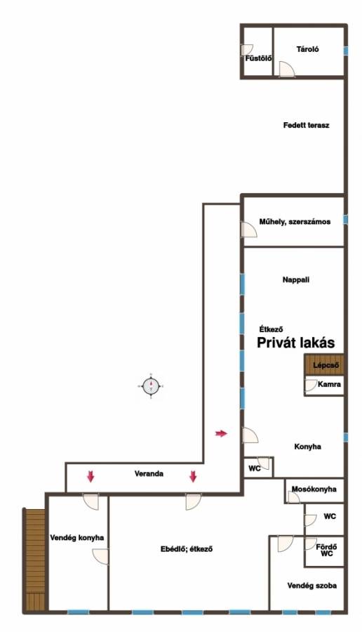 Privát lakótér: 3 szoba + nappali + dupla komfort (összesen 100 m²), modernizált, külön bejárattal