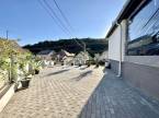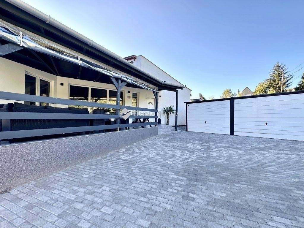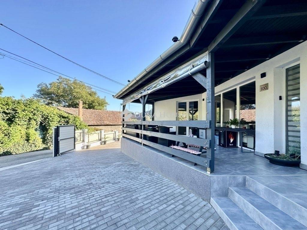 Az udvaron két mobilgarázs és egy fúrt kút található, a térkövezett parkoló pedig kényelmes parkolási lehetőséget biztosít. A ház körül lemezkerítés található, így a család teljes biztonságban élhet. A terasz fölött féltető helyezkedik el, mely extra kényelmet nyújt.