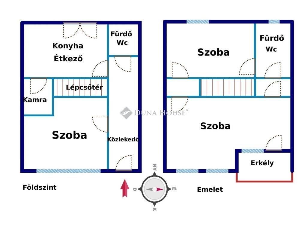 Földszinten: közlekedő, konyha-étkező, kamra, szoba, fürdőszoba + WC, lépcsőtér
