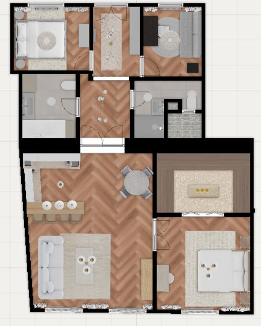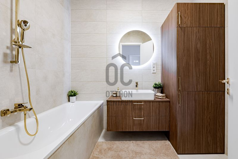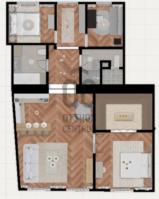 A klimatizált lakás 91 m2-es. Az ingatlanba belépve egy nagy méretű előszobába érkezünk. Ebből nyílik két kisebb méretű szoba. Továbbhaladva egy előtérbe érünk, ahonnan a 2 fürdőszobába juthatunk. Az egyik fürdőben walk-in zuhanykabin, a másikban pedig fürdőkád van.