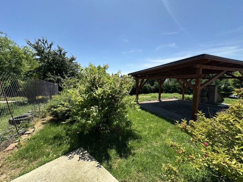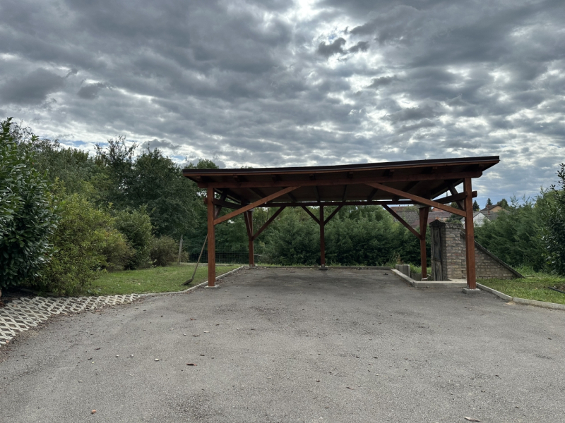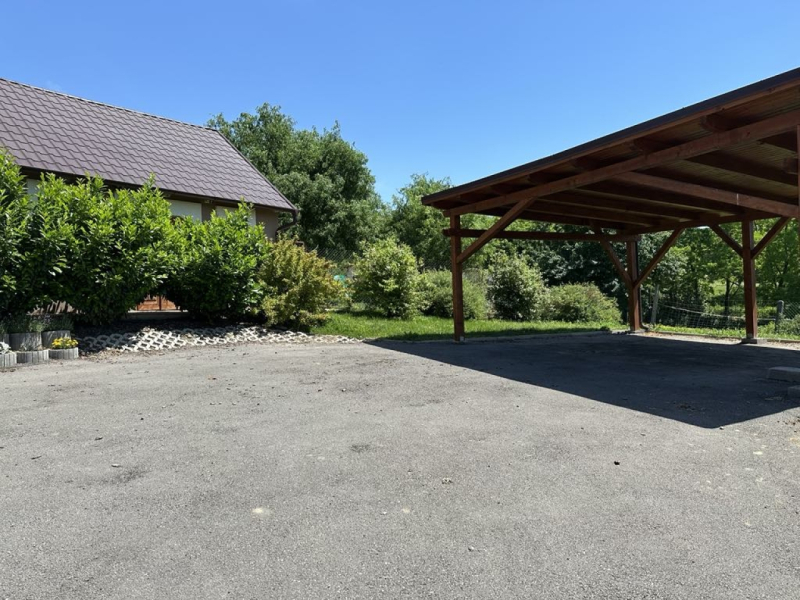 Az udvar egy része térkővel borított, két gépkocsi tárolására a fedett beállóban adott a lehetőség. A telken egy téglával kirakott, jó állapotú pince is teret kapott.