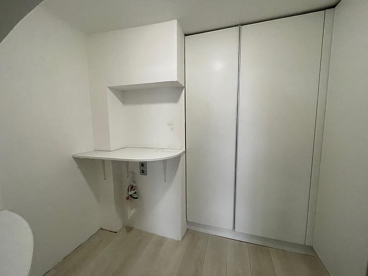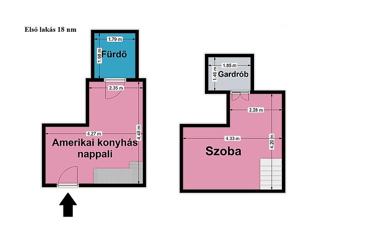 Az egyik lakás egy kisebb alapterületű, kompakt, de minden igényt kielégítő otthon: az alsó szint 18 nm, a galériával együtt 35 nm. Ideális lehet rövid távú kiadásra, fiatal pároknak vagy akár irodai használatra is. Teljeskörű felújításon esett át, modern burkolatokkal, beépített bútorokkal és gépesített konyhával, így azonnal költözhető vagy hasznosítható.