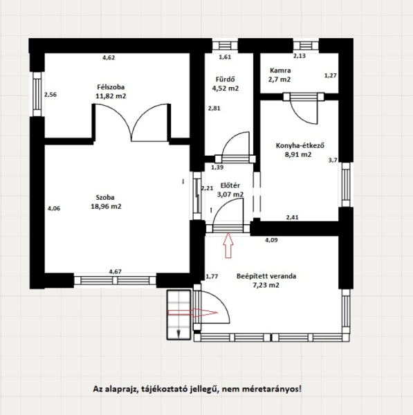 A fő épület tégla falazatú, az úgynevezett „ KÁDÁRKOCKA”, ami 1+1 szobás, nettó 57,21 m² alapterületű.