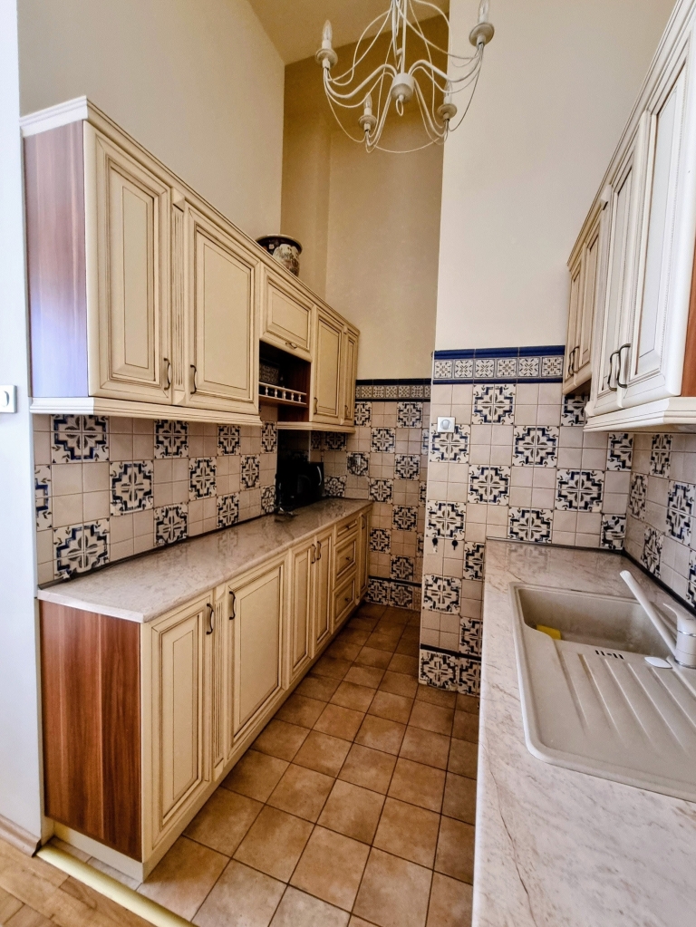 Bejáratnál továbbhaladva rögtön megnyílik előttünk a tér, a ragyogóan napfényes nappalis konyhába érkezünk meg, valamint innen elérhető egy vendég wc, tágas dolgozó/háló aminek egy hangulatos kertre néző félkör erkélye is van, valamint helyet kapott egy külön háló és egy zuhanyzóval beépített tágas fürdőszoba is.